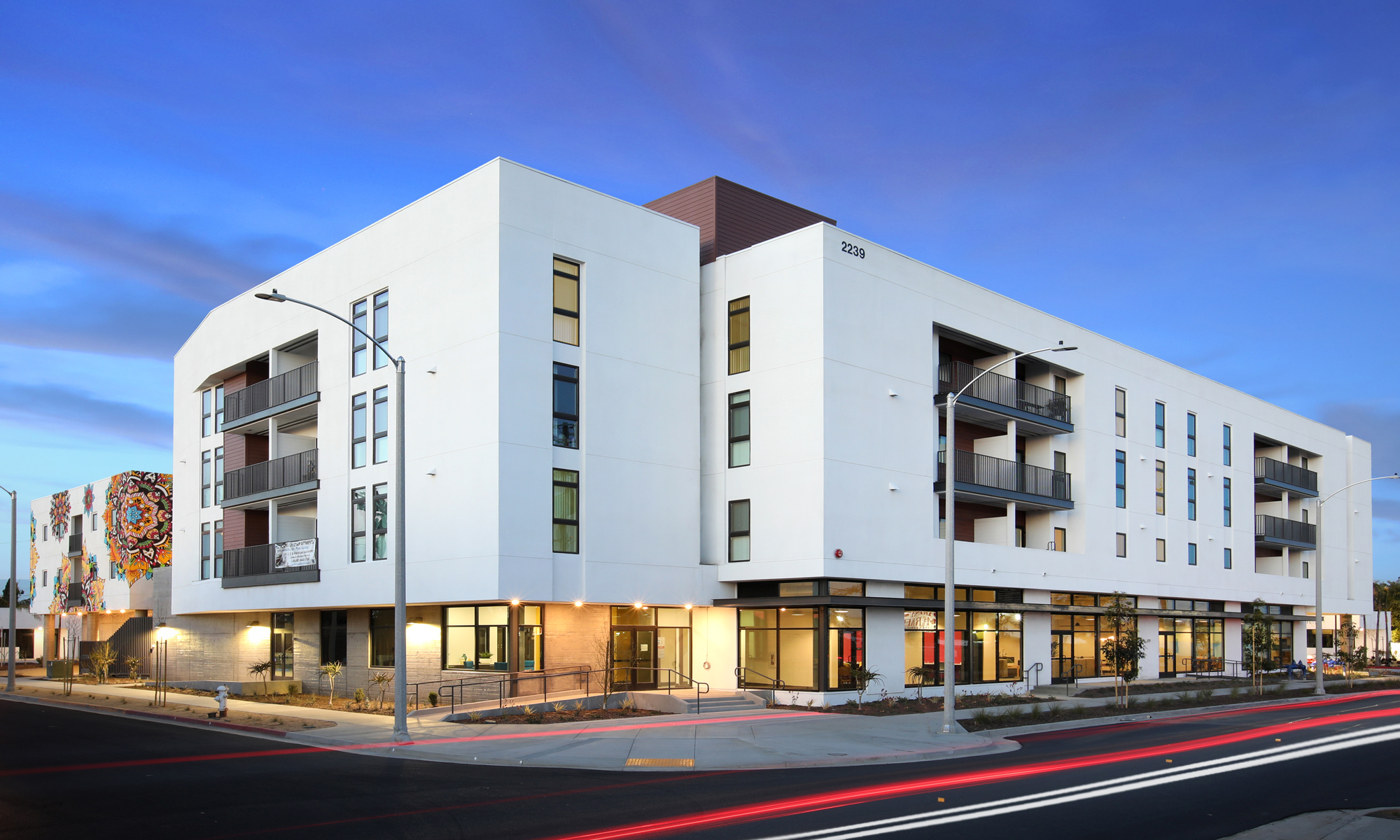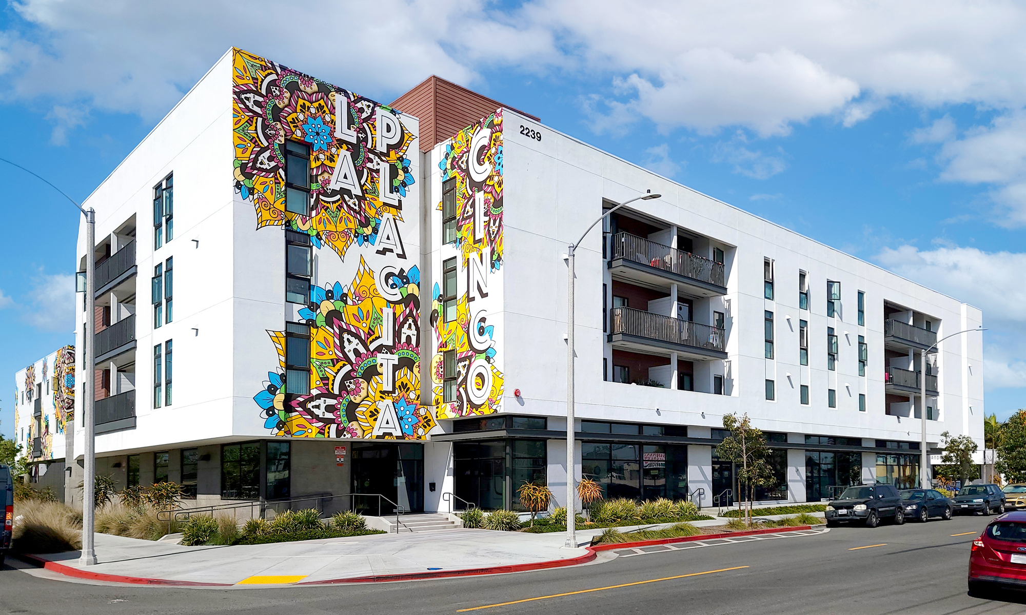 The new high-density mixed-use apartment project on a 5.13 Acre site in Mission Valley, San Diego, provides 267 residential units and 10 shopkeeper units. The Type III apartment building wraps a 5-story Type I parking