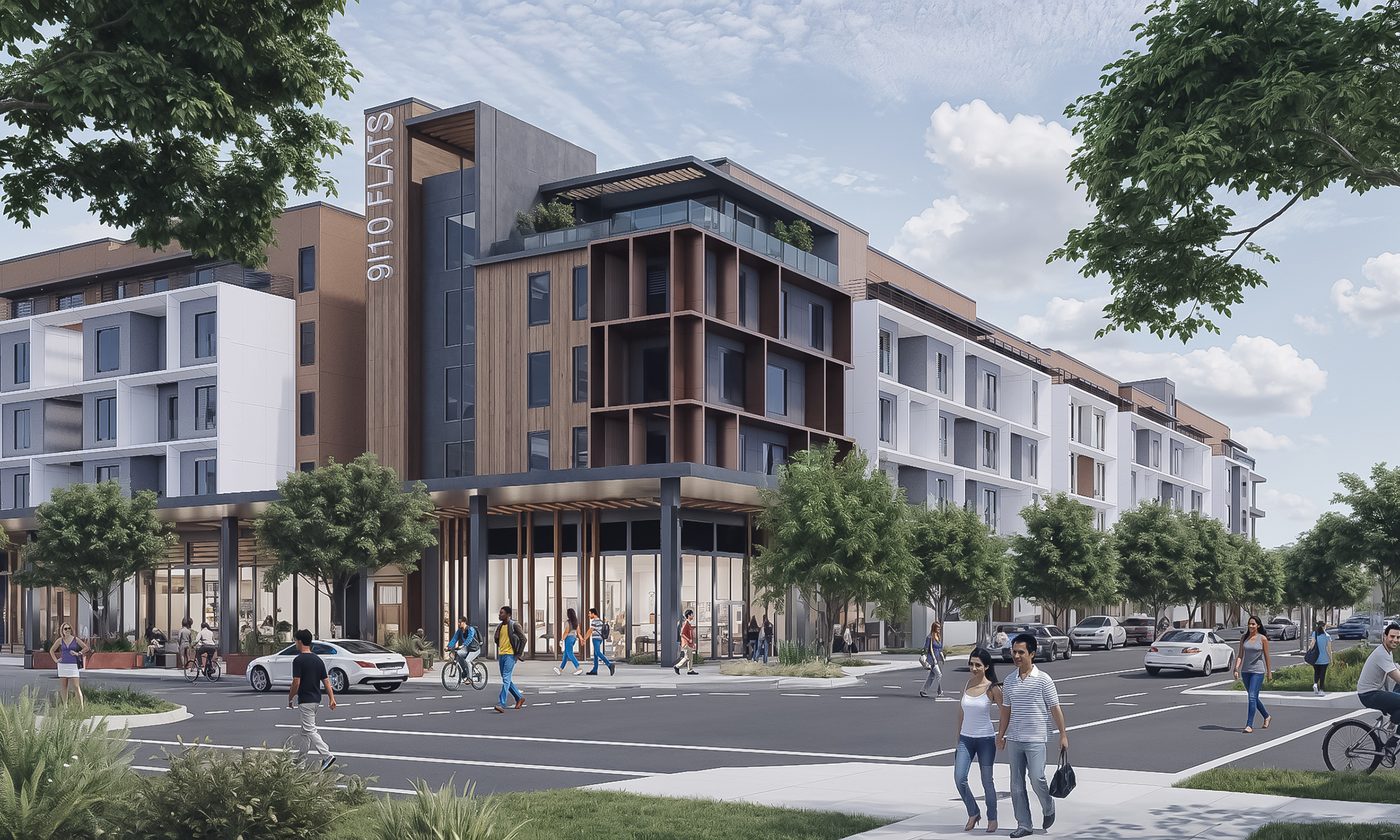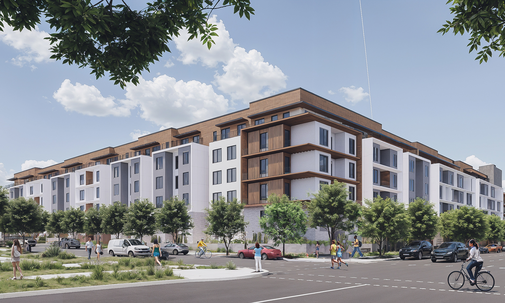The new high-density mixed-use apartment project on a 5.13 Acre site in Mission Valley, San Diego, provides 267 residential units and 10 shopkeeper units. The Type III apartment building wraps a 5-story Type I parking